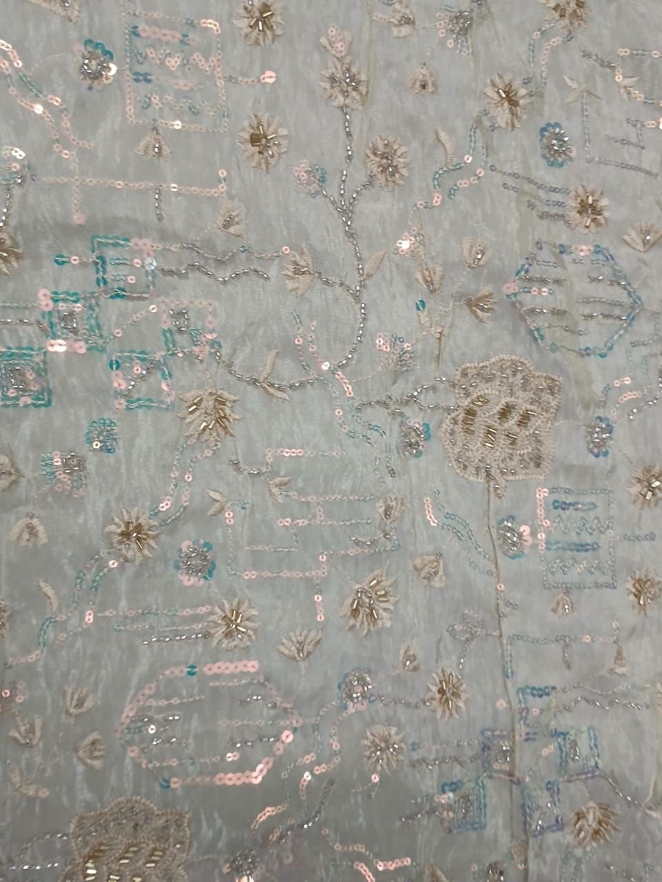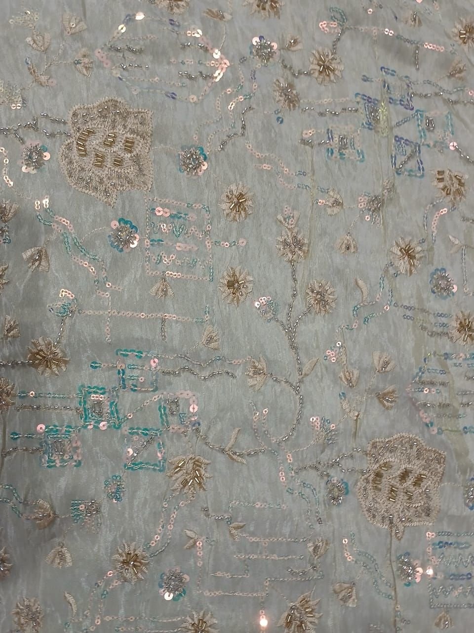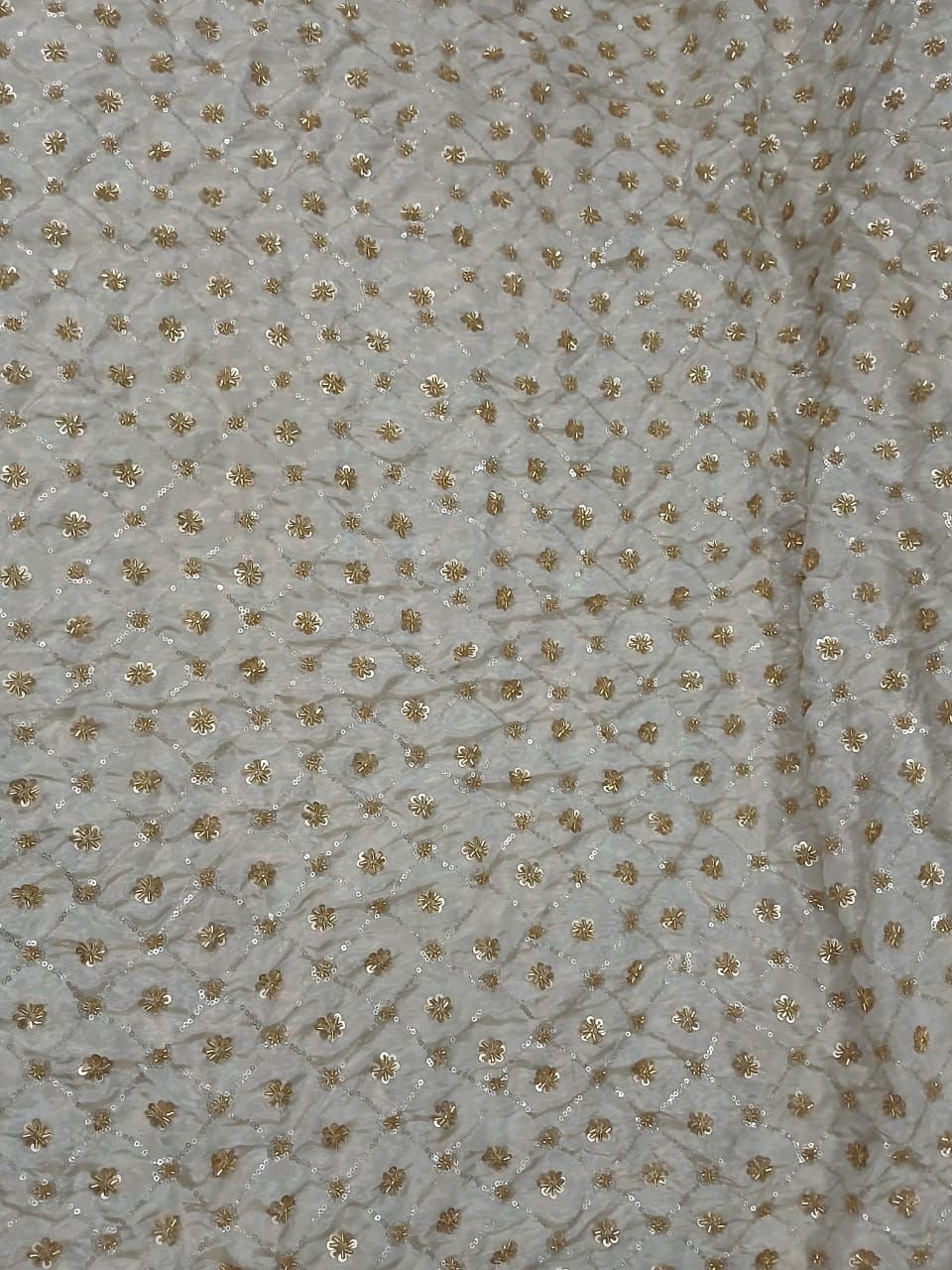 We offer exquisite Golden Floral Embroidered Fabric featuring Sequin & Thread Embroidery on a Premium Net / Soft Mesh Base. Crafted with high-quality Polyester Embroidery Thread, this fabric showcases intricate Small Floral Motifs in elegant Off-White / Cream hues. Imported from India, our fabric is perfect for manufacturers, exporters, and suppliers seeking premium materials. Enjoy fast delivery within 2-3 days domestically. Elevate your creations with this luxurious fabric that exudes sophistication and charm.